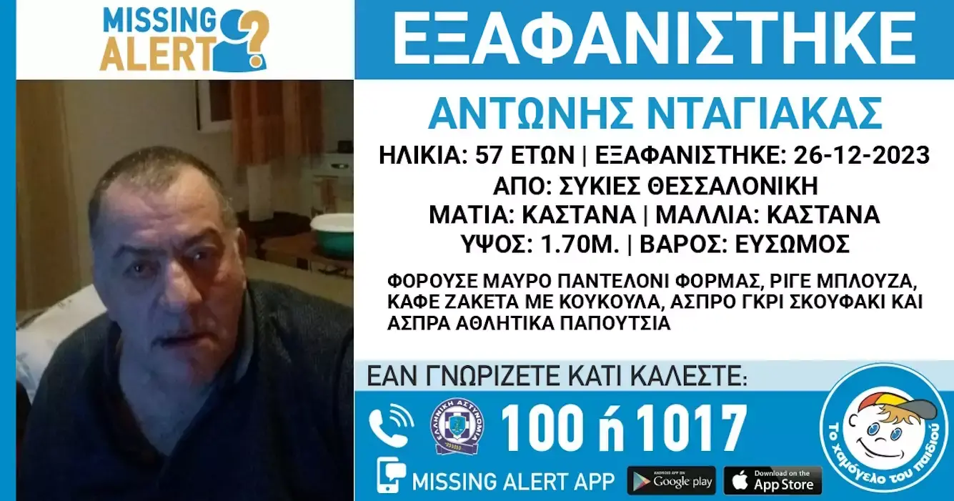 Όπως ενημερώνει το «Χαμόγελο του Παιδιού» για την εξαφάνιση, ο εν λόγω 57χρονος αγνοείται από τις 26 Δεκεμβρίου από την περιοχή των Συκεών Θεσσαλονίκης.