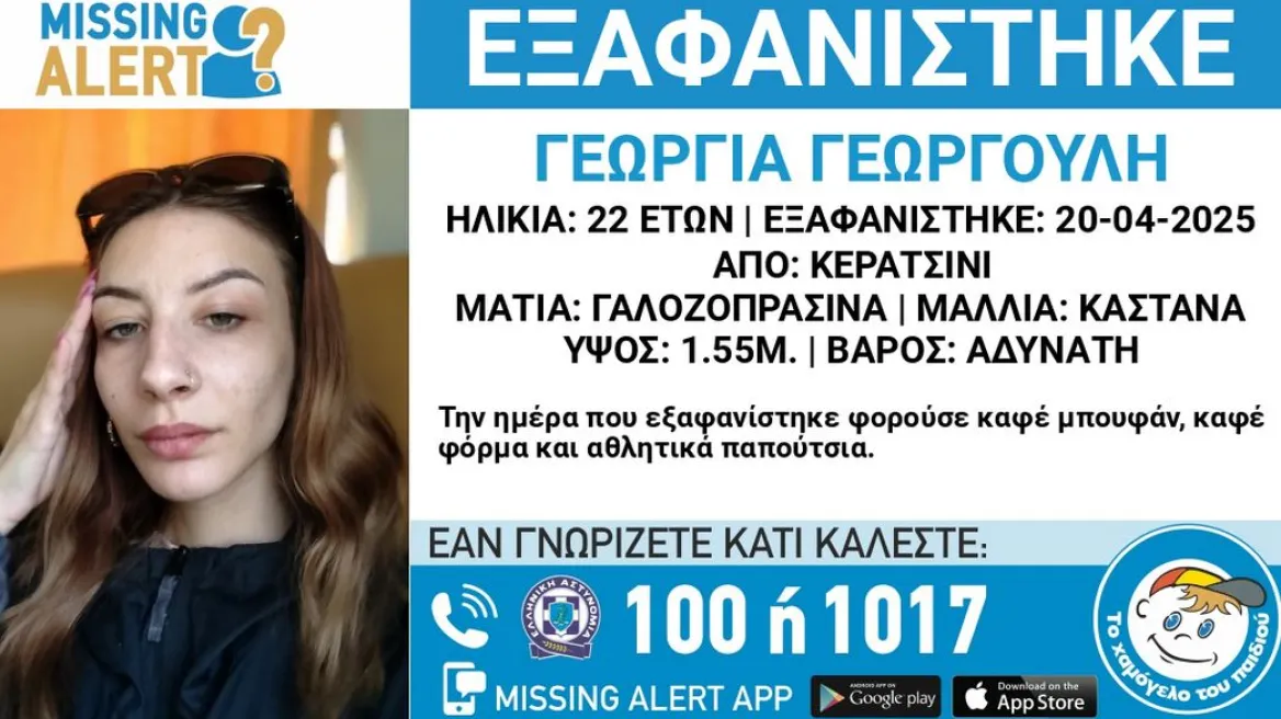 Στις 20/4/2025, εξαφανίστηκε από την περιοχή του Κερατσινίου, η Γεωργούλη Γεωργία,22 ετών. «Το Χαμόγελο του Παιδιού» ενημερώθηκε για την εξαφάνιση της σήμερα 23/4/2025, και προχώρησε στη δημοσιοποίηση των στοιχείων της κατόπιν αιτήματος της οικογένειας της, καθώς ενδέχεται να συντρέχουν λόγοι οι οποίοι θέτουν τη ζωή της σε κίνδυνο.