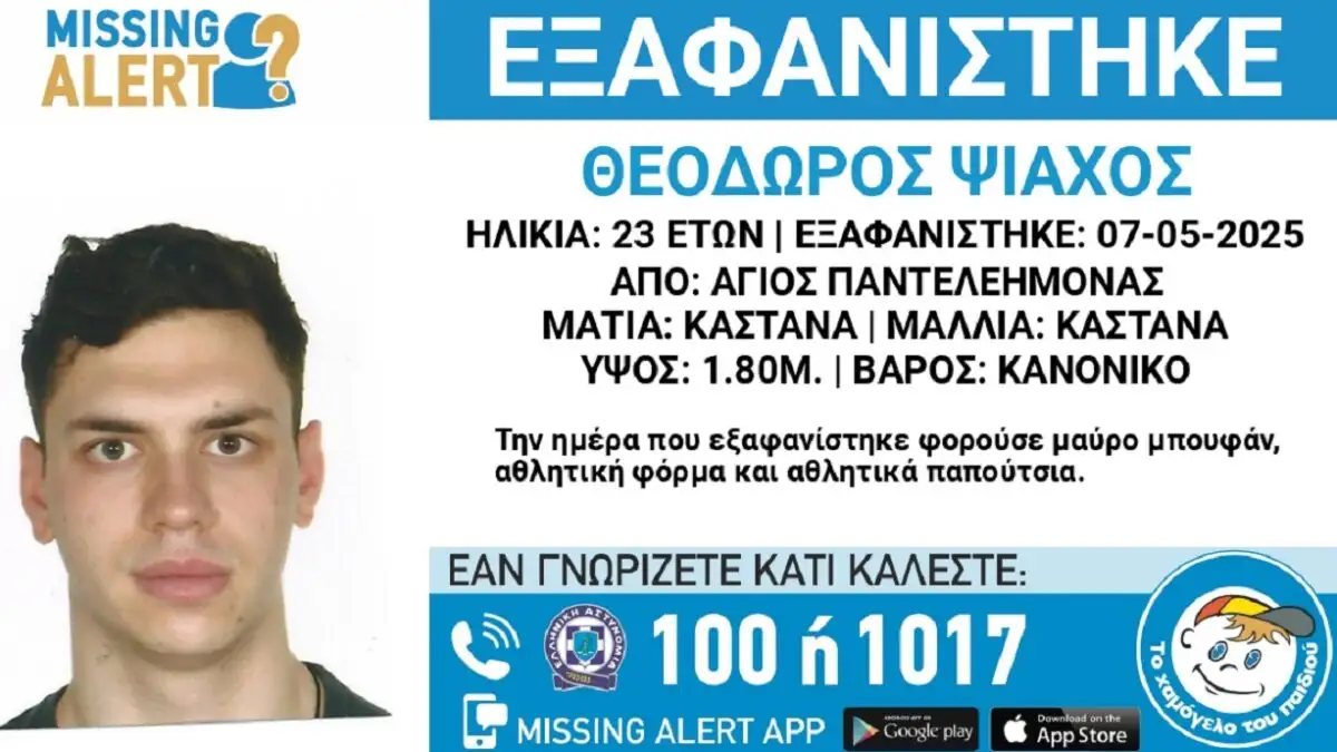 «Το Χαμόγελο του Παιδιού» ενημερώθηκε για την εξαφάνιση του Θεόδωρου Ψιάχου στις 11/05/2025 στον Άγιο Παντελεήμονα, και προχώρησε στη δημοσιοποίηση των στοιχείων του κατόπιν αιτήματος της οικογένειας του, καθώς ενδέχεται να συντρέχουν λόγοι οι οποίοι θέτουν τη ζωή του σε κίνδυνο.