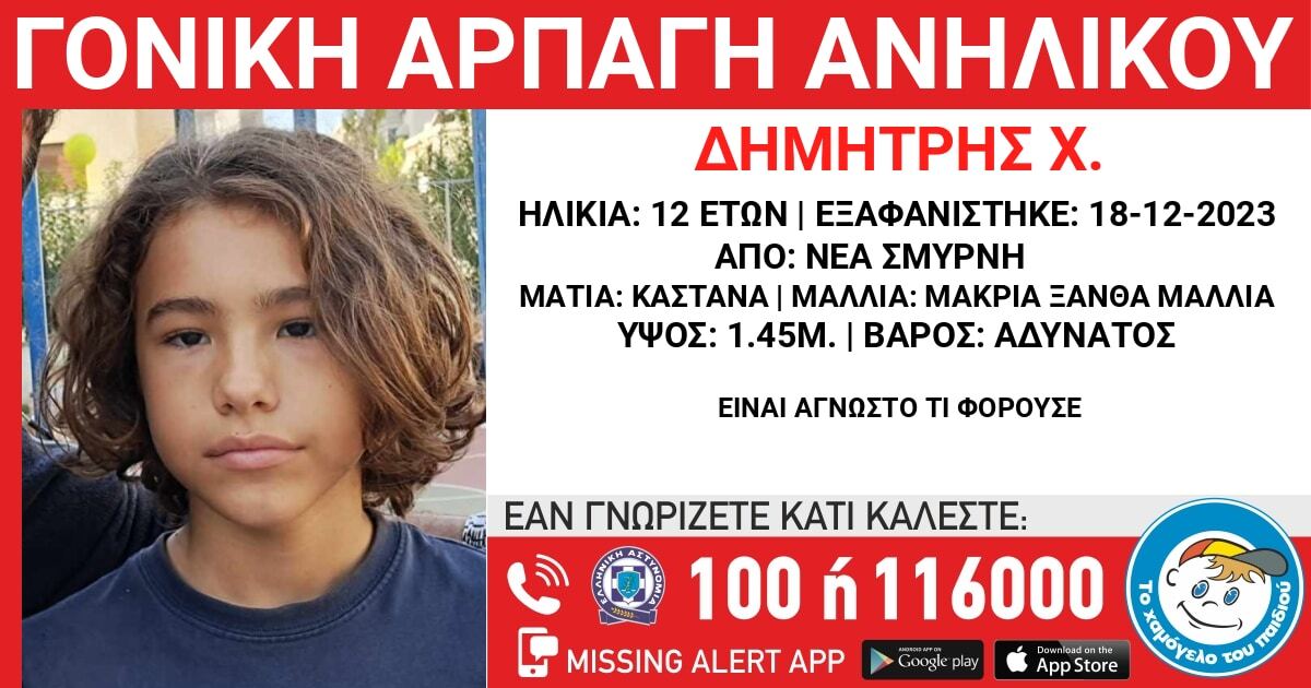 O Δημήτρης Χ. 12 ετών έχει ύψος 1.45 μ., είναι αδύνατος, έχει μακριά ξανθά μαλλιά και καστανά μάτια. Είναι άγνωστο τι φορούσε.