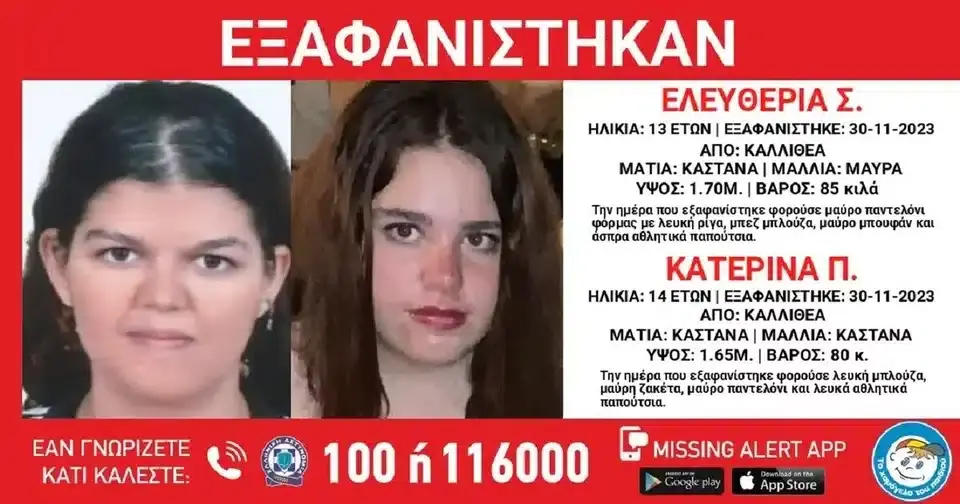 Συναγερμός στις Αρχές το βράδυ της Πέμπτης (30/11) για την εξαφάνιση από την Καλλιθέα δύο κοριτσιών, της 13χρονης Ελευθερίας και της 14χρονης Κατερίνας, που φαίνεται να επιβιβάστηκαν σε ταξί με άγνωστο προορισμό, σύμφωνα με το «Χαμόγελο του Παιδιού».