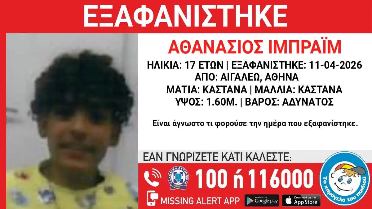 Ο ανήλικος εξαφανίστηκε το πρωί της 11ης Απριλίου από χώρο φιλοξενίας στο Αιγάλεω. Έχει ύψος περίπου 1,60 μ., είναι αδύνατης σωματικής διάπλασης, με καστανά μαλλιά και καστανά μάτια, ενώ δεν είναι γνωστό τι φορούσε τη στιγμή της εξαφάνισης.