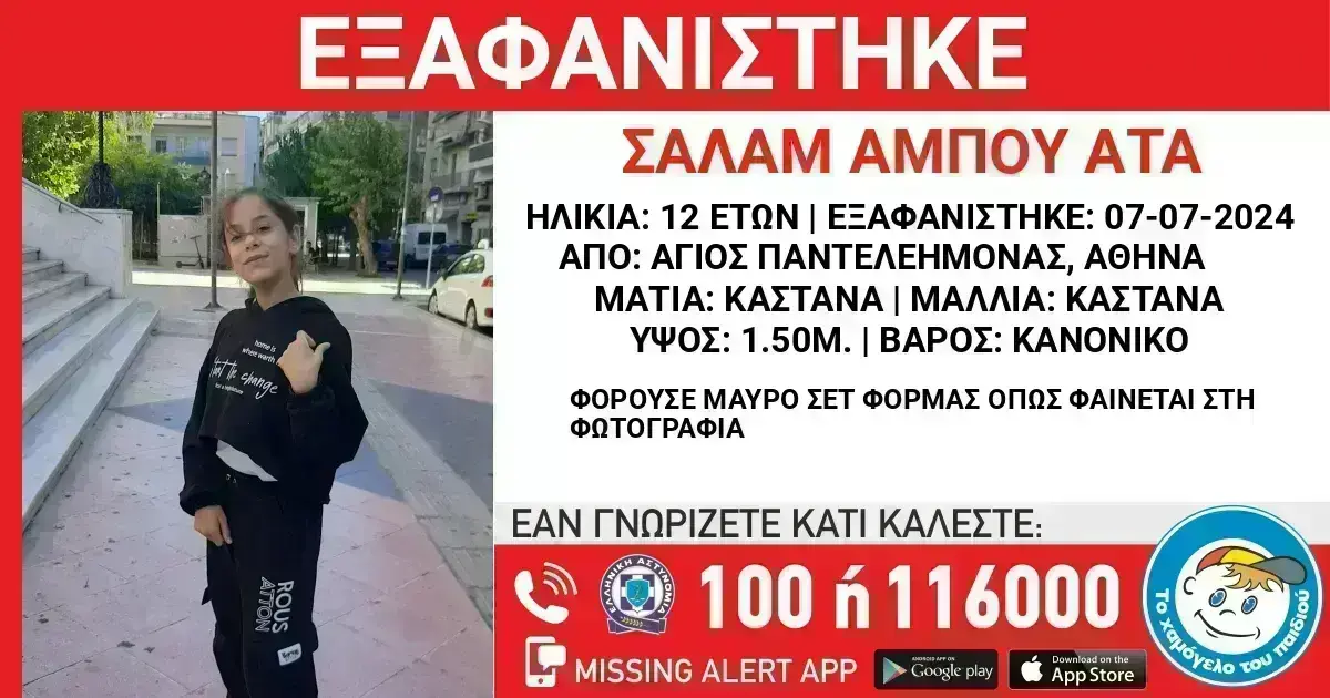Το «Χαμόγελο του Παιδιού» σε ανακοίνωση του, αναφέρει ότι, «στις 07/07/2024, απογευματινές ώρες., εξαφανίστηκε από την περιοχή του Άγιου Παντελεήμονα η Αμπού Ατά (επ.) Σαλάμ (ον.) / Abu Atta (επ.) Salam (ον.), 12 ετών, με καταγωγή από την Παλαιστίνη και μιλάει αραβικά.