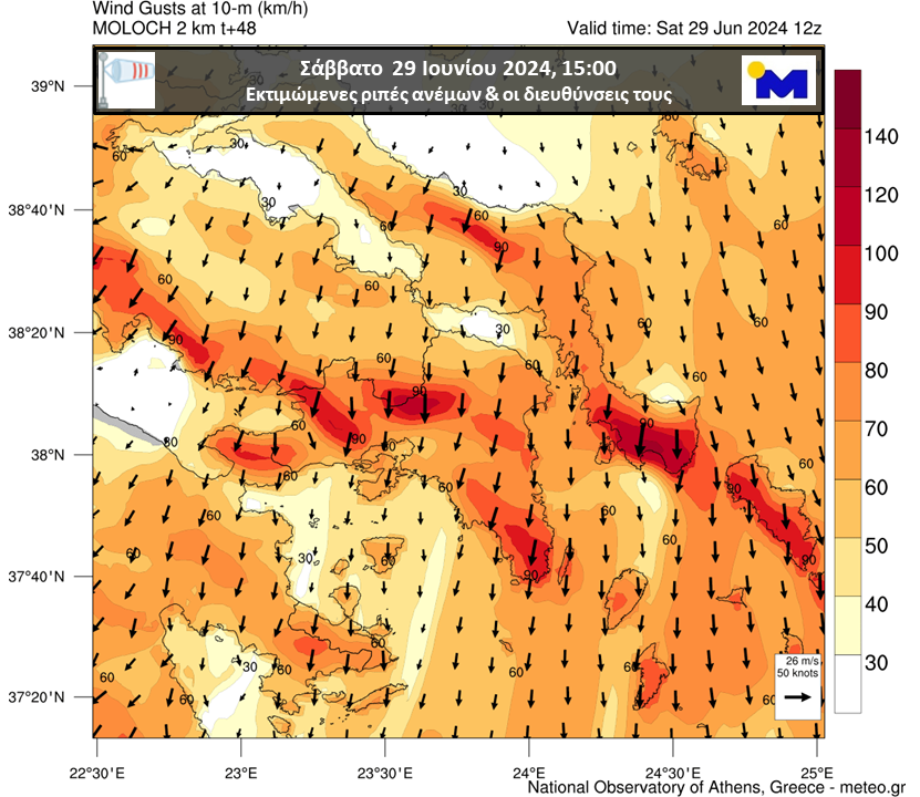 Συγκεκριμένα, σύμφωνα με τα προγνωστικά στοιχεία του Εθνικού Αστεροσκοπείου Αθηνών/Meteo.gr, οι ριπές των ανέμων στην ανατολική Στερεά και στην Εύβοια, αύριο κατά τις μεσημεριανές ώρες, θα φτάσουν τοπικά τα 90 km/h, ενώ στη νότια Εύβοια και σε περιοχές που γειτνιάζουν με έντονη τοπογραφία τα 100 km/h.