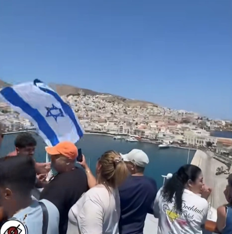 @danielamram22 ״עם ישראל חי״: מול ההפגנות של הפלסטינים ביוון- ככה זה נראה מתוך האוניה. הישראלים לא שתקו הוציאו דגלים והתחילו לרקוד. t.me/danielamram3