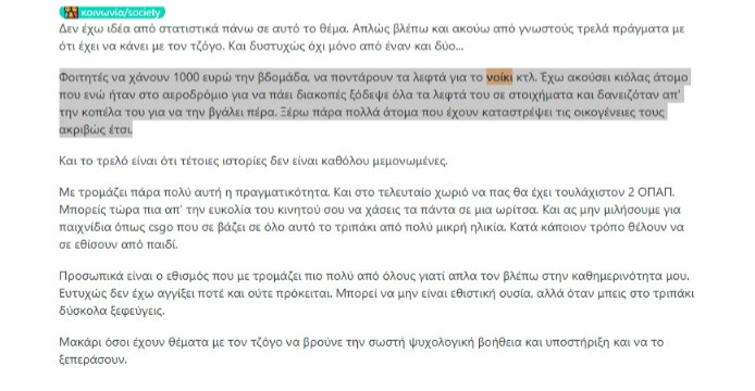 Αυτή είναι η πιο σκληρή αλήθεια, όπως τη λέει ένας άλλος χρήστης. Ο τζόγος, λένε, δεν είναι «τρόπος να βγάλεις λεφτά». Είναι τρόπος να χάσεις τον έλεγχο. Και ειδικά όταν μιλάμε για φρουτάκια – όπου δεν υπάρχει καν δεξιότητα, μόνο κουμπιά – η εθιστική μηχανική είναι φτιαγμένη ακριβώς για να σε κρατάει εκεί. Το πιο εύστοχο σχόλιο το έκανε ο χρήστης “Grig***” ο οποίο ανέφερε πως “Τα παιδιά που ασχολούνται με στοίχημα κυρίως μιλάνε/ σκέφτονται συνέχεια για αυτό”.