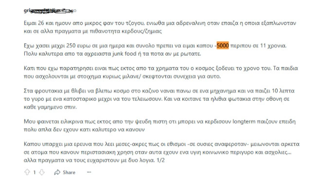 Σε δεκάδες threads μέσα στα τελευταία χρόνια, οι Έλληνες χρήστες μιλούν για φρουτάκια, στοίχημα, καζίνο, και ό,τι άλλο τραβάει η… τύχη τους. Η συζήτηση ξεκινάει συχνά «για πλάκα» – με κάποιον να λέει πως έβγαλε 100€ από ένα δεκάευρο – και καταλήγει με δεκάδες ιστορίες για χαμένες περιουσίες, σπασμένες οικογένειες και εθισμούς που δεν ξεχωρίζουν από αυτούς των ναρκωτικών.