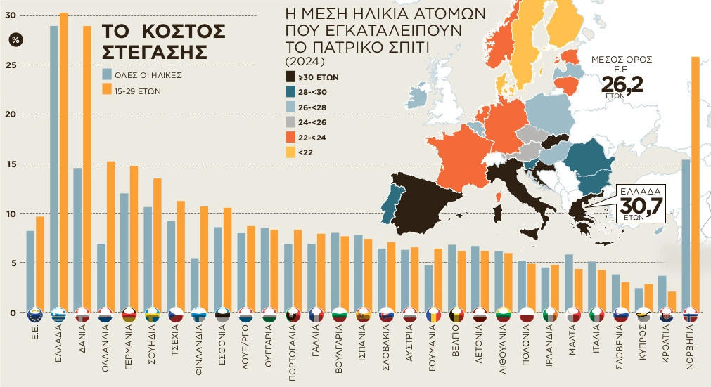 Μοναδική εξαίρεση, παρατηρεί η Ευρωπαϊκή Στατιστική Αρχή, είναι η χώρα μας, καθώς, παρά τη μεταγενέστερη αποχώρηση των νέων, το κόστος στέγασης παραμένει υψηλό.