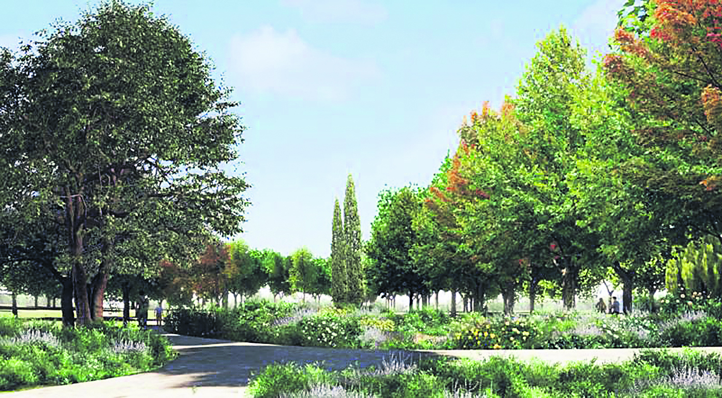 Τα δένδρα περιτοιχίζονται από μεσαίους θάμνους (μυρτιές) και ψηλούς (σχίνα), τονίζοντας την καθαρότητα του άξονα και αποκαλύπτοντας σταδιακά τους επιμέρους χώρους. Με τη μελέτη ανασυστήνονται ο θόλος των Κυπαρισσιών, ανατολικά του τένις, και ο Κυπαρισσώνας στην περιοχή του σπειροειδούς Λαβυρίνθου, καθώς και ο μικρός Οπωρώνας στο βορειοανατολικό τμήμα των κήπων, στις θέσεις που υπήρχαν, ενώ προβλέπεται η επαναδημιουργία του ξέφωτου στο χώρο που έχει ταυτοποιηθεί από αεροφωτογραφία. Σημειώνεται ότι η περιμετρική περιοχή μπορεί να δράσει και ως ζώνη επιβράδυνσης πυρκαγιάς, καθώς τα επιλεγμένα δένδρα -πλατύφυλλα και φυλλοβόλα- και ο υπόροφός τους καθυστερούν την επέκταση της φωτιάς.