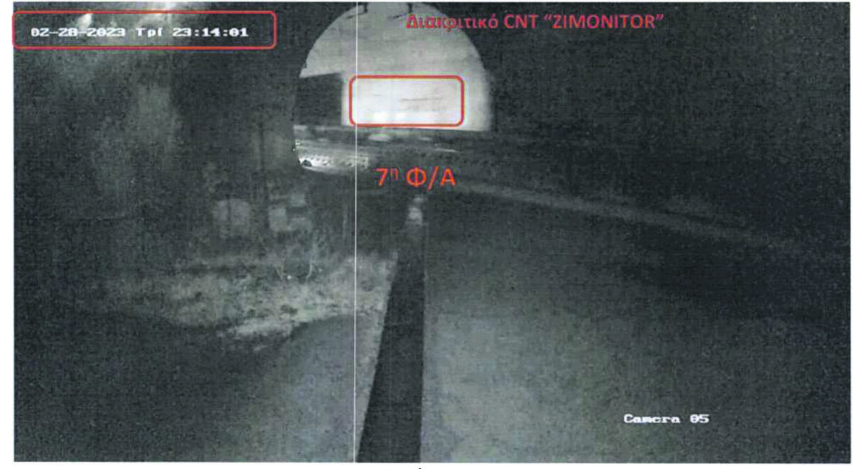 Στο πρώτο βίντεο φαίνεται η εμπορική αμαξοστοιχία στη γραμμή καθόδου με κατεύθυνση προς Λάρισα, στις 23:03 της μοιραίας νύχτας της 28ης Φεβρουαρίου 2023, ενώ στο δεύτερο φαίνεται στην ίδια γραμμή, δέκα λεπτά αργότερα (23:13).
