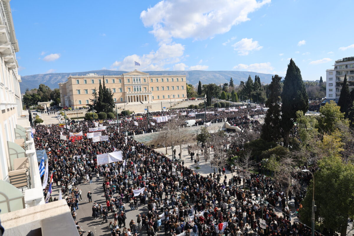 Νωρίτερα, χιλιάδες πολίτες συμμετείχαν στο συλλαλητήριο, απαιτώντας δικαιοσύνη για τις συνθήκες του δυστυχήματος. Αν και σαφώς μειωμένη η συμμετοχή του κόσμου σε σχέση με το μεγαλειώδες συλλαλητήριο του 2025, ο κόσμος γέμισε κάθε γωνιά της πλατείας. Από την είσοδο του Εθνικού Κήπου μέχρι το ύψος του κτηρίου του υπουργείου Εσωτερικών αλλά και σε όλη τη πλατεία Συντάγματος μέχρι την αρχή της Ερμού, βρίσκονταν πολίτες όλων των ηλικιών που συμμετείχαν στο συλλαλητήριο.