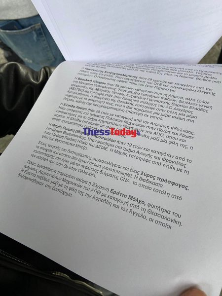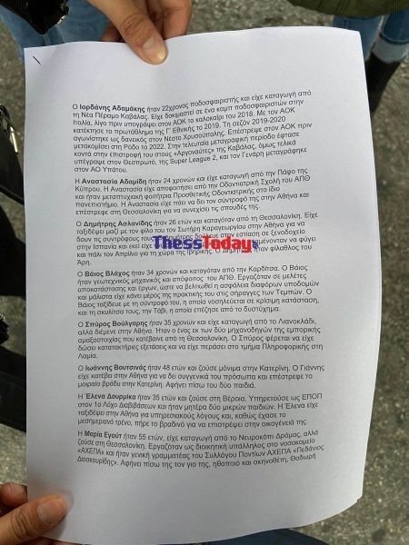 Περιμένοντας το επιβατικό τρένο από την Αθήνα, που ξαναμπήκε στις ράγες μετά τη σύγκρουση των τρένων στα Τέμπη, ο Άγγελος Τσιαμούρας, ο οποίος έσωσε 10 άτομα και ο Χρήστος Κωνσταντινίδης, όπου έχασε την γυναίκα του, μοίραζαν φυλλάδια με τα ονόματα των 57 νεκρών.