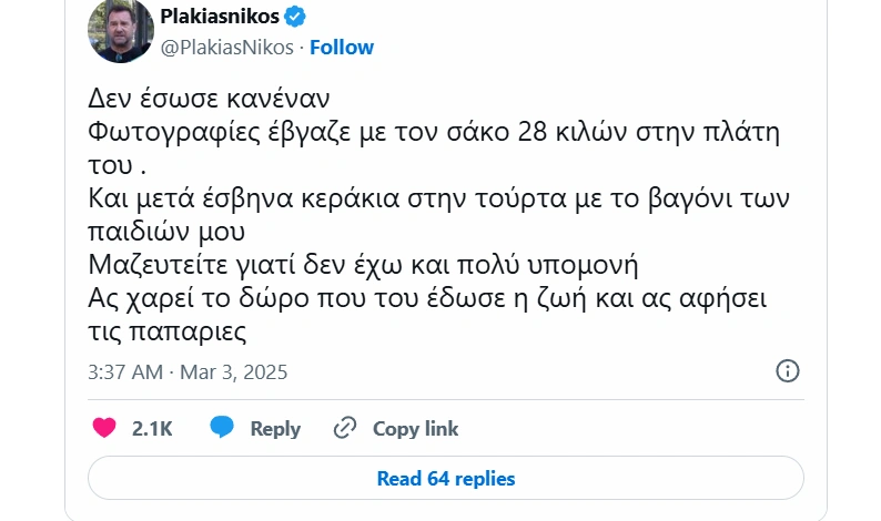 Απαντώντας σε χρήστη του X/Twitter, ο Νίκος Πλακιάς έγραψε: «Δεν έσωσε κανέναν Φωτογραφίες έβγαζε με τον σάκο 28 κιλών στην πλάτη του . Και μετά έσβηνα κεράκια στην τούρτα με το βαγόνι των παιδιών μου. Μαζευτείτε γιατί δεν έχω και πολύ υπομονή Ας χαρεί το δώρο που του έδωσε η ζωή και ας αφήσει τις παπ…ες».