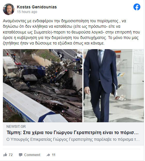 Στην ανάρτησή του ο πρόεδρος του σωματείου, που είχε προειδοποιήσει για τις παθογένειες στον σιδηρόδρομο πολλές φορές πριν το δυστύχημα, γράφει χαρακτηριστικά: «Αναμένοντας με ενδιαφέρον την δημοσιοποίηση του πορίσματος, να δηλώσω ότι δεν κλήθηκα να καταθέσω (είτε ως πρόσωπο – είτε να καταθέσουμε ως Σωματείο) – παρότι το θεωρούσα λογικό – στην επιτροπή που όρισε η κυβέρνηση για την διερεύνηση του δυστυχήματος. Το μόνο που μας ζητήθηκε ήταν να δώσουμε τα εξώδικα όπως και κάναμε».