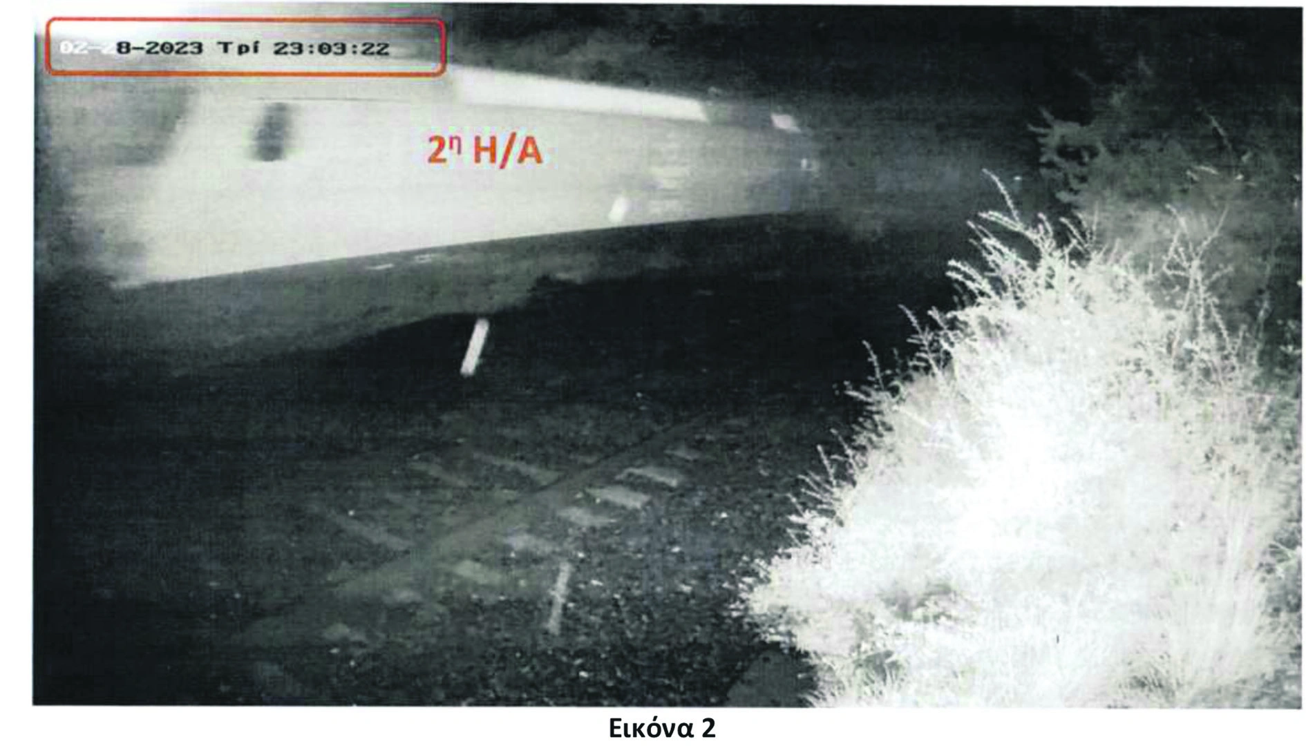 Αντίθετα, «δεν υπάρχει χρονική ταύτιση του χρονογράφου της ηλεκτράμαξας 120-012, με την αναγραφόμενη χρονοσήμανση του ελεγχόμενου βιντεοληπτικού υλικού της σήραγγας των Τεμπών. Η απόκλιση πιθανότατα οφείλεται σε λάθος χρονισμό του καταγραφικού των καμερών και της προπορείας του σχετικά με την ώρα Ελλάδος, αλλά χωρίς την παρουσία εξωτερικού παρατηρητή (σταθμάρχης Σ.Σ Ραψάνης) ή άλλου τεχνικού βοηθήματος δεν μπορεί να επιβεβαιωθεί».
