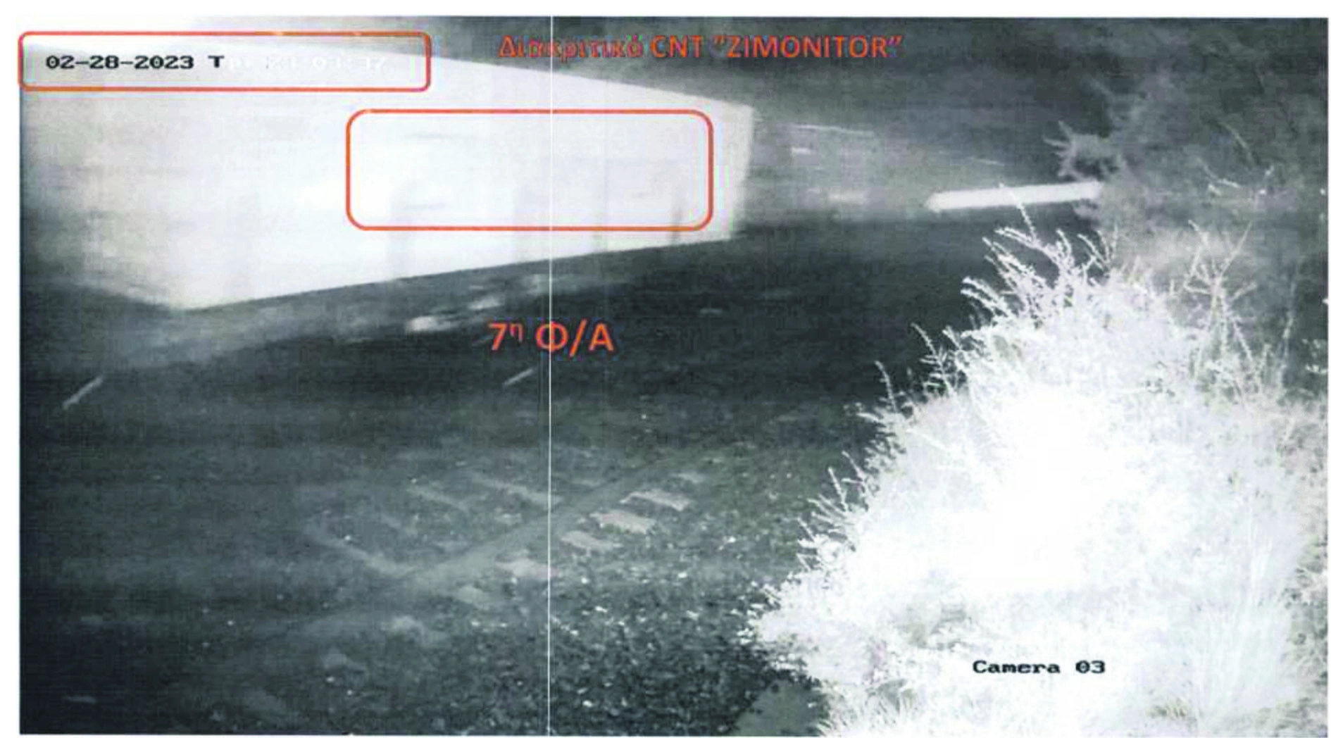 Στο πρώτο βίντεο φαίνεται η εμπορική αμαξοστοιχία στη γραμμή καθόδου με κατεύθυνση προς Λάρισα, στις 23:03 της μοιραίας νύχτας της 28ης Φεβρουαρίου 2023, ενώ στο δεύτερο φαίνεται στην ίδια γραμμή, δέκα λεπτά αργότερα (23:13).