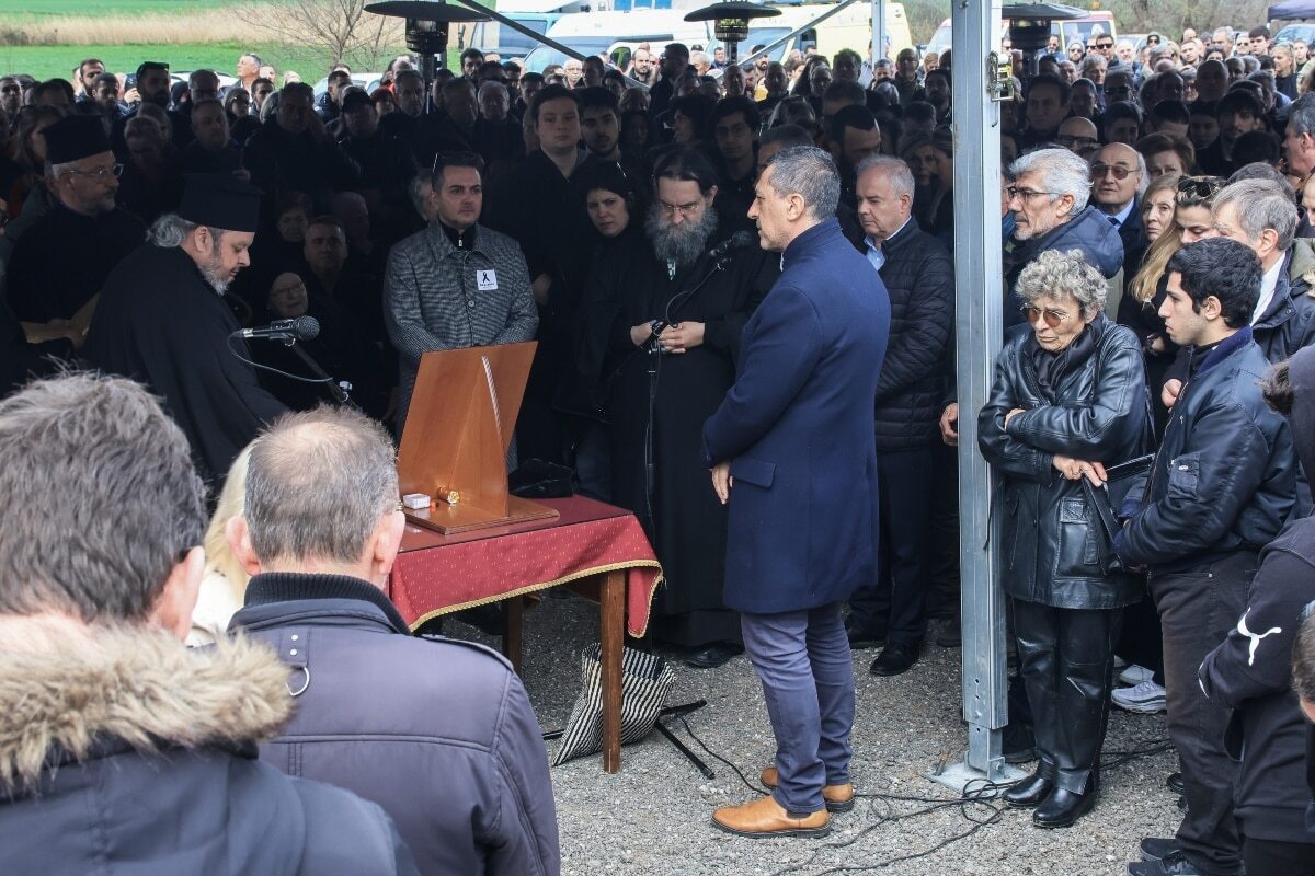 Ο ιερέας που διάβασε τα ονόματα των θυμάτων κατά τη διάρκεια του τρισάγιου, ξέσπασε σε κλάματα και έσπασε η φωνή του. Όλοι οι παρευρισκόμενοι φορούσαν στο στήθος ένα ασπρόμαυρο αυτοκόλλητο με μια μαύρη κορδέλα και την ημερομηνία 28.02.2023 που σημειώθηκε το δυστύχημα.