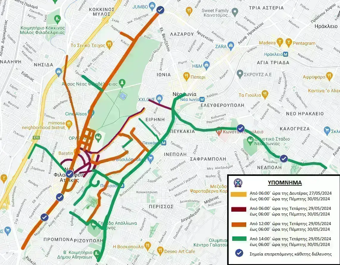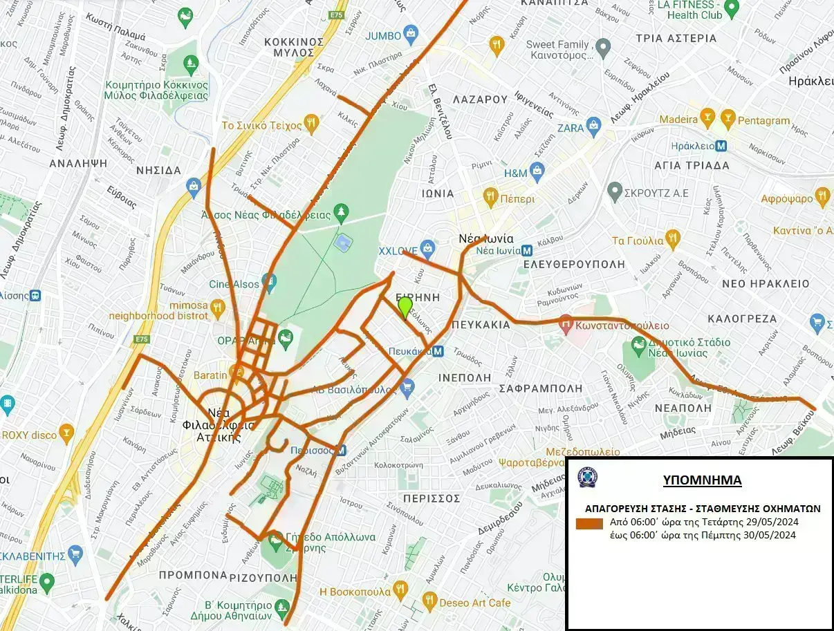 Λόγω της διεξαγωγής του Τελικού Αγώνα Ποδοσφαίρου «UEFA EUROPA CONFERENCE LEAGUE» στο γήπεδο «AEK ARENA» μεταξύ των ομάδων Ολυμπιακός – Forentina την Τετάρτη 29-5-2024, θα πραγματοποιηθούν κυκλοφοριακές ρυθμίσεις από τη Διεύθυνση Τροχαίας Αττικής σε οδούς και λεωφόρους των Δήμων Νέας Ιωνίας, Αθηναίων, Μεταμόρφωσης, Νέας Φιλαδέλφειας – Νέας Χαλκηδόνας και Πειραιώς, ως ακολούθως: