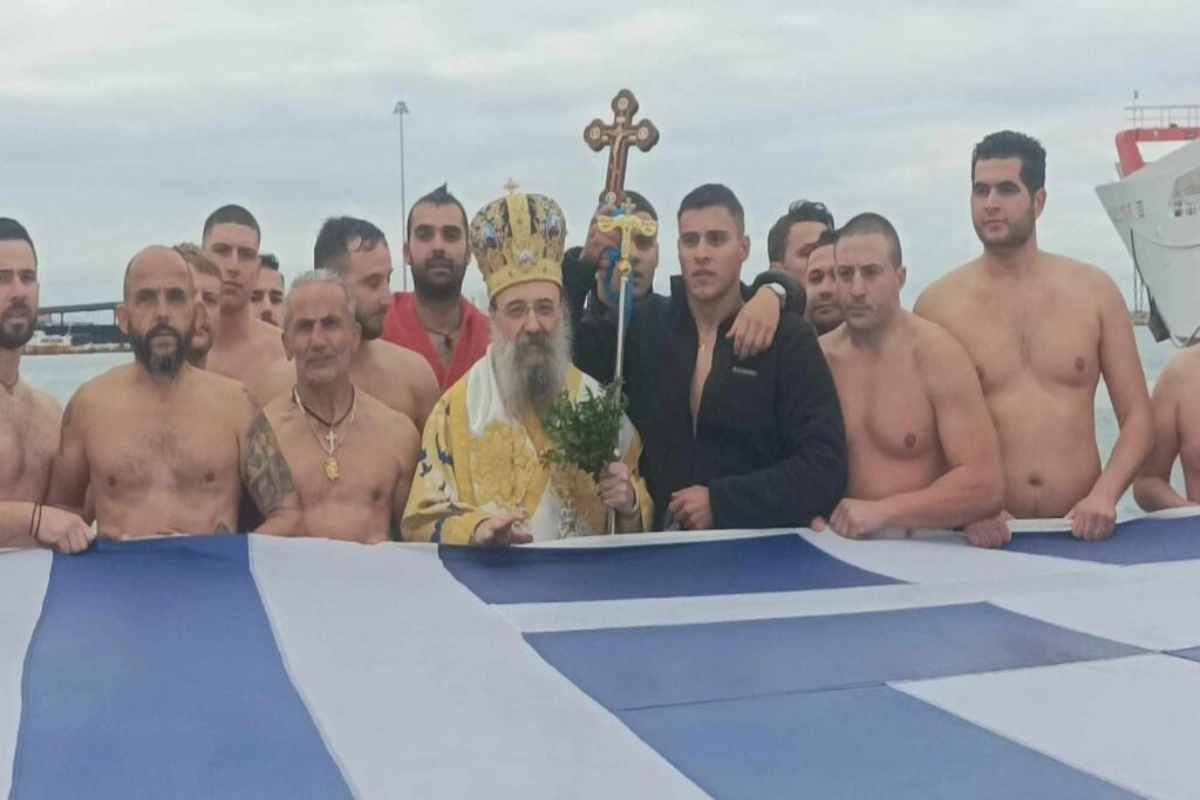 Για να πιάσουν τον σταυρό στη θάλασσα βούτηξαν 15 κολυμβητές και τον σταυρό έπιασε, για δεύτερη φορά, ο 19χρονος Ιωάννης Λιάκος, δόκιμος Λιμενοφύλακας.
