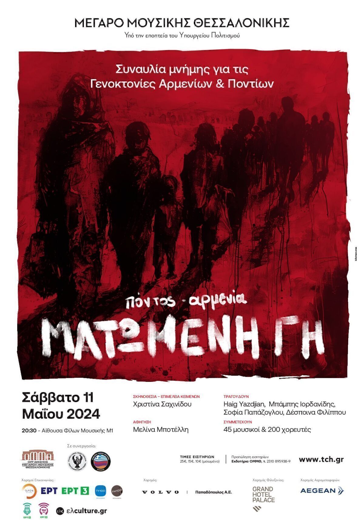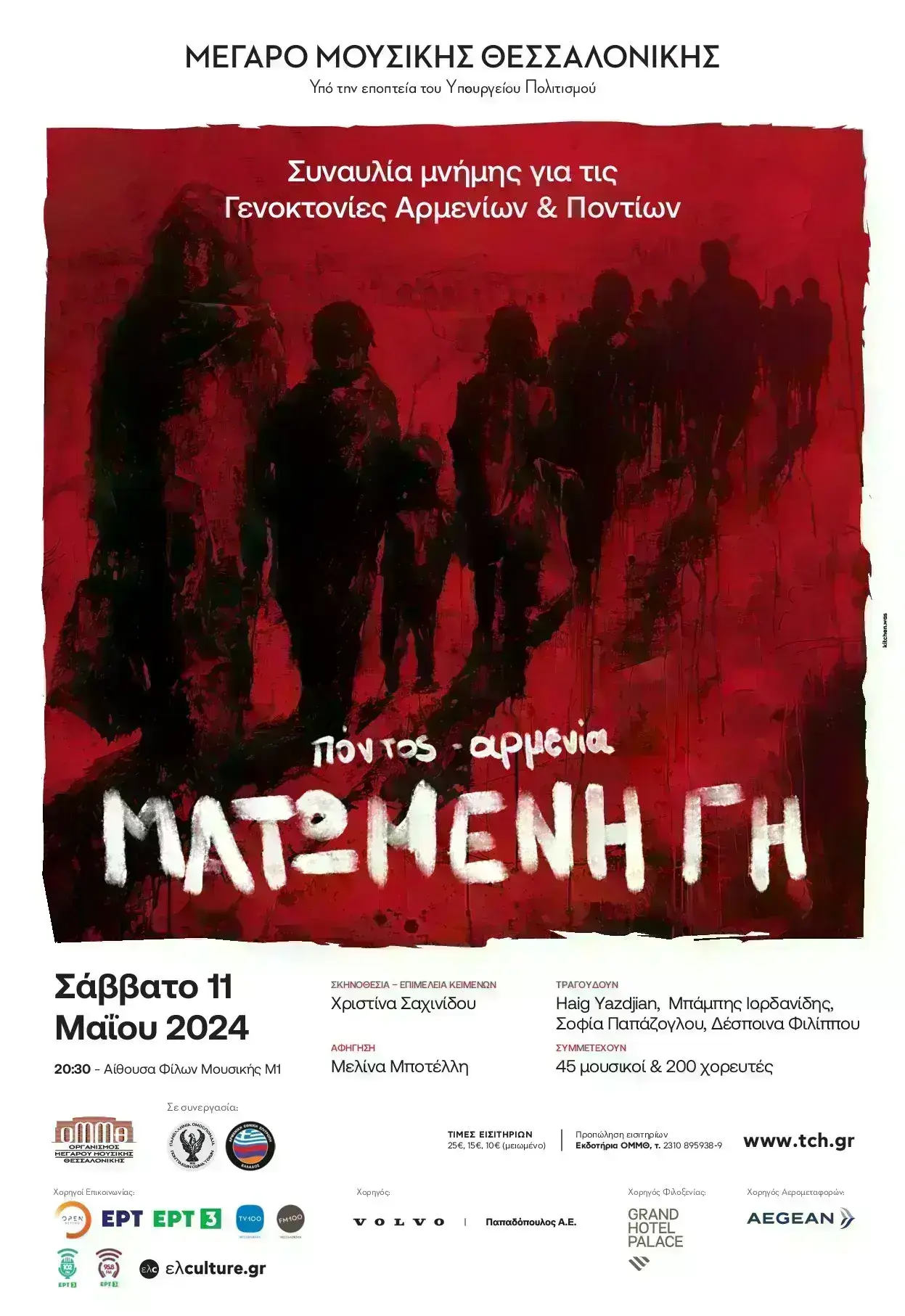 Με όχημα τον λόγο, τους ήχους της μουσικής, τις φωνές τραγουδιστών και τα βήματα διακοσίων χορευτών, η παράσταση «Πόντος – Αρμενία: Ματωμένη Γη» έχει στόχο να φωτίσει την ιστορία για τις γενοκτονίες των Αρμενίων και των Ποντίων.