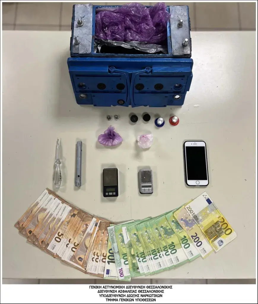 Επίσης, κατασχέθηκαν, (1) κατσαβίδι και (1) σωληνωτό κλειδί, τα οποία βρέθηκαν στο χώρο και χρησιμοποιούνταν για τη διάνοιξη της μπαταρίας, καθώς και το χρηματικό ποσό των (3.500) ευρώ ως προερχόμενο από διακίνηση ναρκωτικών, το οποίο βρέθηκε κρυμμένο εντός συσκευής βραστήρα.