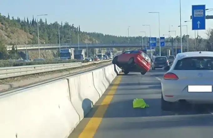 Όπως θα δείτε και στην φωτογραφία, το αυτοκίνητο, περίπου στις 14:45, για άγνωστη αιτία, εξετράπη της πορείας του και «καβάλησε» το τσιμεντένιο στηθαίο.