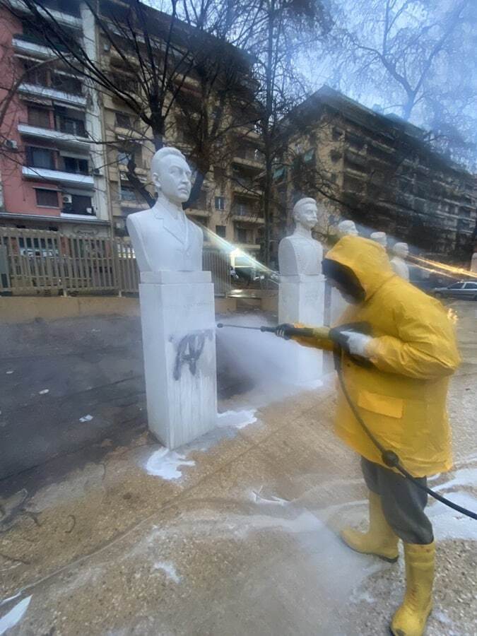 Συνεργείο της Διεύθυνσης Καθαριότητας του Δήμου Θεσσαλονίκης καθάρισε το πρωί της Τρίτης (5/3) τις μπογιές από τις προτομές.