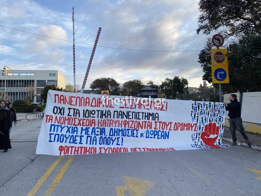 Σε συμβολικούς αποκλεισμούς εισόδων του Αριστοτελείου Πανεπιστημίου Θεσσαλονίκης προχωρούν μέλη φοιτητικών συλλόγων, διαμαρτυρόμενοι για την επικείμενη ψήφιση του νομοσχεδίου περί ίδρυσης μη κρατικών πανεπιστημίων.