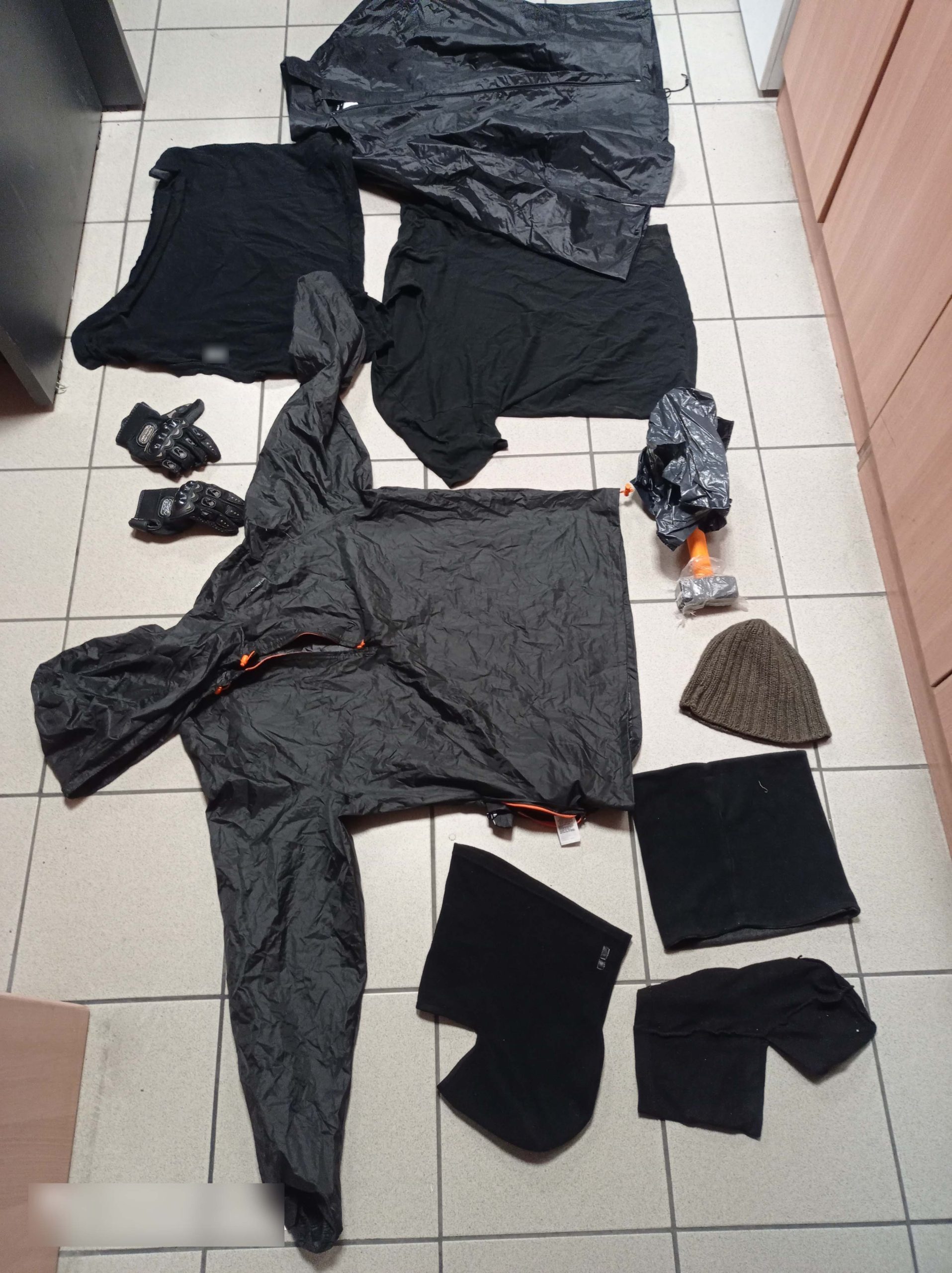 Στην κατοχή των δύο συλληφθέντων βρέθηκαν -μεταξύ άλλων- και κατασχέθηκαν τσάντες, εντός των οποίων υπήρχαν μαύρες κουκούλες τύπου full face, μαύρα μπουφάν με ενσωματωμένες κουκούλες (πέραν των μπουφάν που ήδη φορούσαν), γάντια μοτοσικλέτας και μία βαριοπούλα, η λαβή της οποίας ήταν τυλιγμένη με σακούλα.