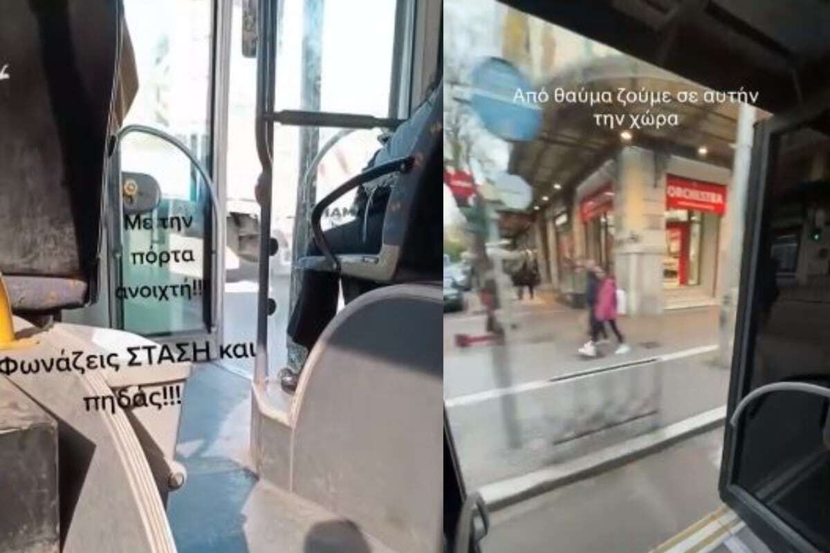 Σε λεωφορείο στη Σταυρούπολη μία γυναίκα έχει ακουμπήσει πάνω στην ανοιχτή πόρτα και κρατιέται από το χερούλι όσο το λεωφορείο κινείται κανονικά. Μπροστά της όρθιος επίσης ένας άντρας. Κάνει μία προσπάθεια να τραβήξει την πόρτα να κλείσει, αλλά μάταια. Ο οδηγός του λεωφορείου βάζει μπρος συνεχίζει την πορεία του.