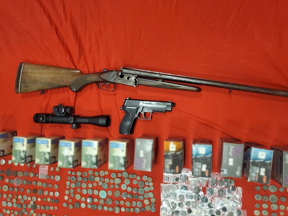 Ακολούθησε έρευνα στο σπίτι του, παρουσία δικαστικού λειτουργού, στο πλαίσιο της οποίας, μεταξύ άλλων, εντοπίστηκαν και κατασχέθηκαν 2.456 αρχαία νομίσματα, κυνηγετικό όπλο, πιστόλι, διόπτρα, 377- φυσίγγια, 14 δαχτυλίδια (11 χάλκινα και τρία αργυρά), τρία χάλκινα βυζαντινά βραχιόλια, δύο μολύβδινα token, δύο χάλκινα σταθμία εργαστηρίου, τρεις σκωρίες εργαστηρίου, ένα χάλκινο ατρακτοειδές εξάρτημα, ένα αργυρό ενώτιο, ένα αργυρό κομβίο, ένας περίπατος, μία καρφίτσα και δέκα εξαρτήματα μεταλλικών αγγείων.