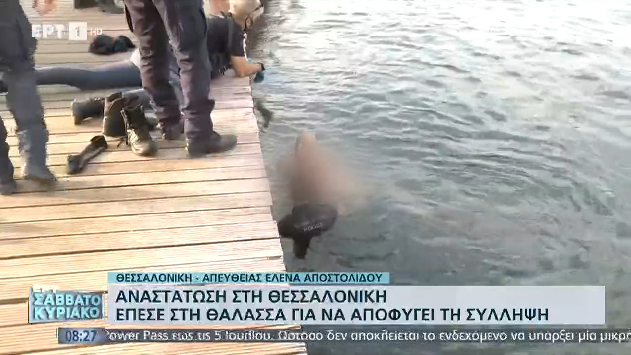 Οι αστυνομικοί που έφθασαν εκεί τον ακινητοποίησαν περνώντας του χειροπέδες για να το προσάγουν, στην προσπάθειά τους όμως να τον βάλουν στο περιπολικό κατάφερε και να ξεφύγει τρέχοντας προς την παραλιακή. Οι αστυνομικοί τον πλησίασαν και του ζήτησαν να τους ακολουθήσει αλλά εκείνος έπεσε στα νερά του Θερμαϊκού. Οι άνδρες βούτηξαν πέρασαν ένα σκοινί στα χέρια του και τον έβγαλαν έξω, με τον άνδρα να φωνάζει “αφήστε με να πεθάνω, δεν θέλω να βγω”.