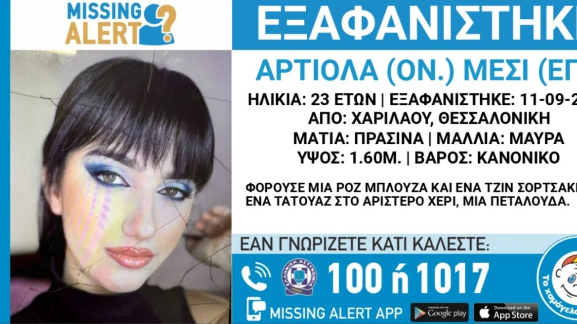 Σύμφωνα με ανακοίνωση του «Χαμόγελου του Παιδιού«, στις 11/09/2024, απογευματινές ώρες, εξαφανίστηκε από την περιοχή της Χαριλάου, στην Θεσσαλονίκη, η Αρτιόλα (ον.) Μέσι (επ.), αλβανικής καταγωγής, 23 ετών.
