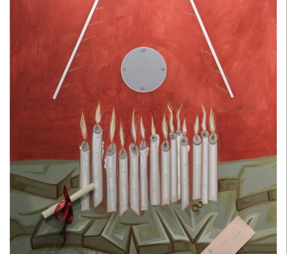 Ένα εισιτήριο τρένου με αναγραφόμενο προορισμό τη «Χώρα Ζώντων», δύο βέρες, ένα κλειδί, ένα ρολόι δίχως δείκτες -σύγχρονα αντικείμενα ενταγμένα σε ένα έργο βυζαντινής ζωγραφικής, σε έναν καμβά διαστάσεων 1,61×1 με ακρυλικά χρώματα, συνθέτουν μία εικόνα που εκπέμπει ένα μήνυμα παρηγορητικό και μία υπόσχεση μνήμης και προσευχής.