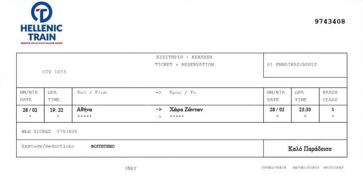 Δύο εισιτήρια αναφέρουν την ώρα αναχώρησης από την Αθήνα και την ώρα άφιξης στον ουρανό, που είναι η ίδια ώρα της σύγκρουσης των δύο τρένων. Ως τελικός προορισμός αναγράφεται στο εισιτήριο η «Χώρα των Ζώντων», δηλαδή εκεί όπου ζουν οι ψυχές. Στο κάτω μέρος δεξιά, εκεί που τα εισιτήρια των τρένων αναγράφουν «καλό ταξίδι», το εισιτήριο στον πίνακα ζωγραφικής γράφει «Καλό Παράδεισο».
