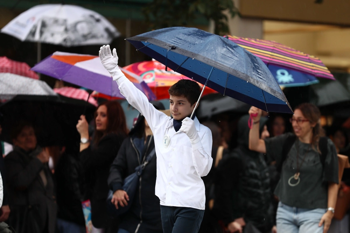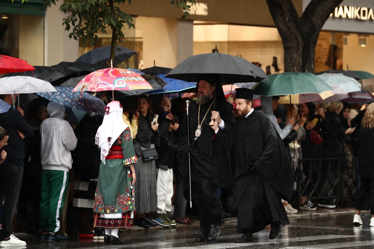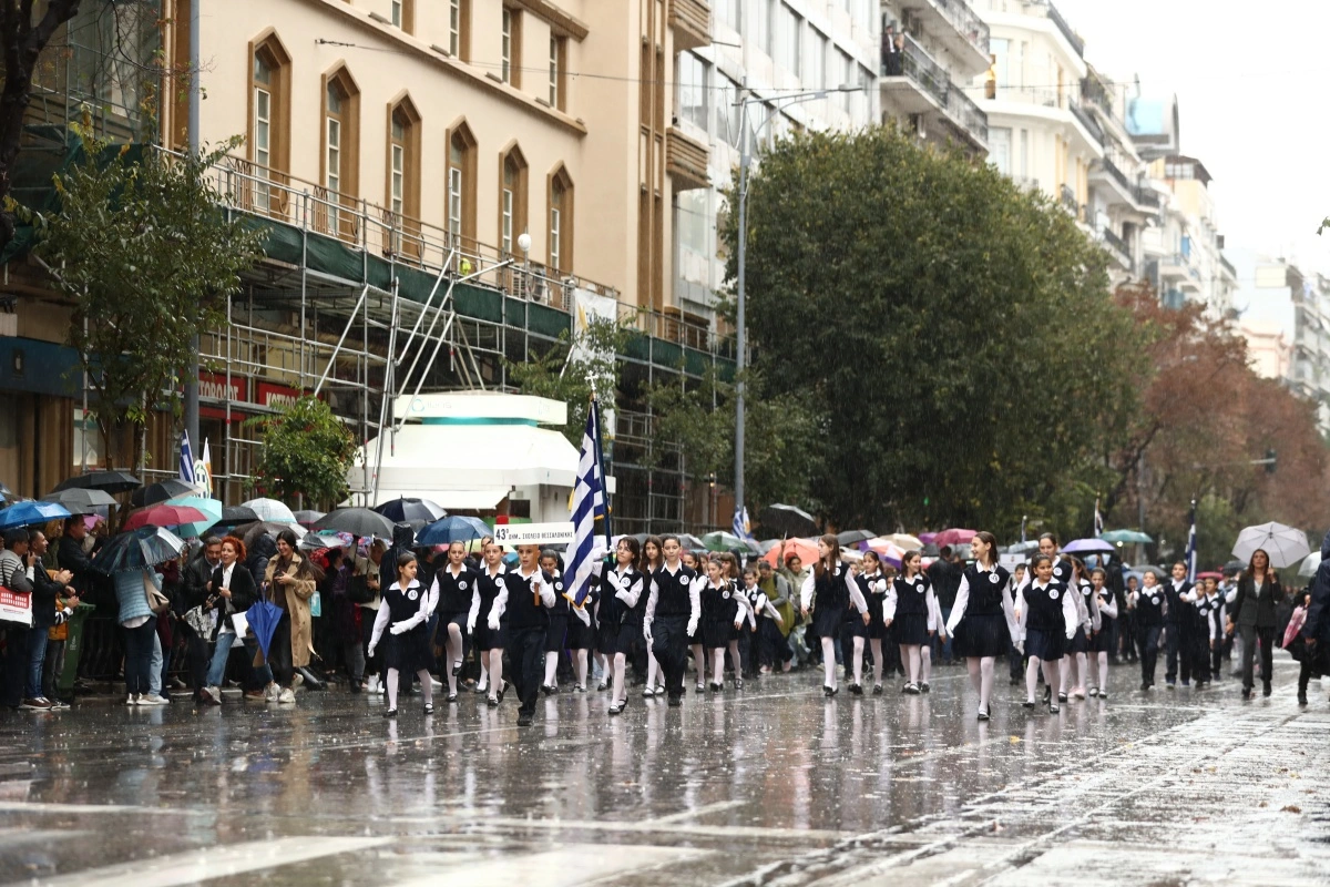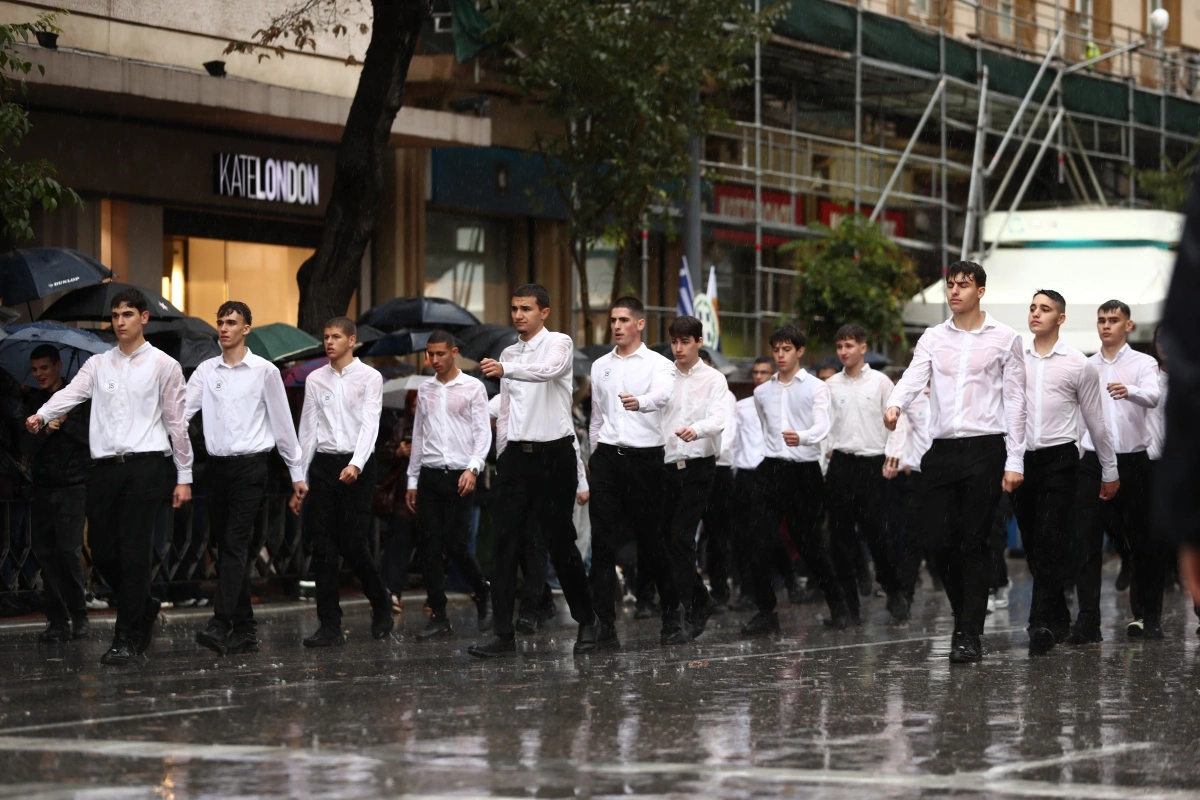 Παρά την έντονη βροχόπτωση οι μαθητές σχολείων της πόλης παρελαύνουν με περηφάνια στην οδό Τσιμισκή, τιμώντας την επέτειο του «Όχι».