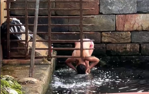 Με το νερό να φτάνει μέχρι τα γόνατα η η κοπέλα έλουσε τα μαλλιά της, προκαλώντας απορίες για την κίνησή της αυτή.