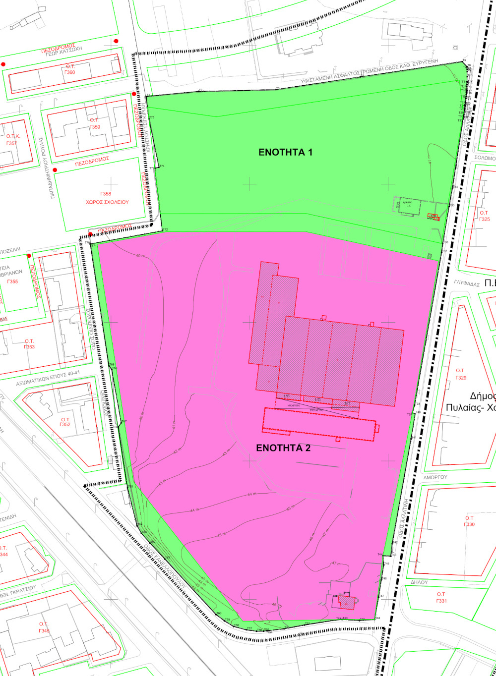Το ενιαίο οικοδομικό τετράγωνο προτείνεται να οργανωθεί σε δύο ενότητες. Συγκεκριμένα, η πρώτη αφορά τα τμήματα του ακινήτου που θα αποδοθούν ως εισφορά γης για τη διαπλάτυνση των υφιστάμενων οδών και για τη δημιουργία νέου σημαντικού μεγέθους κοινόχρηστου χώρου. Η δεύτερη ενότητα αφορά το τμήμα του ακινήτου που θα αναπτυχθεί ο υπερτοπικός πόλος μητροπολιτικού χαρακτήρα αστικών κεντρικών λειτουργιών και πολιτισμού και περιλαμβάνει το σύνολο των διατηρητέων κτισμάτων.