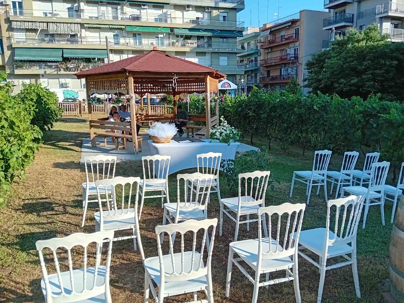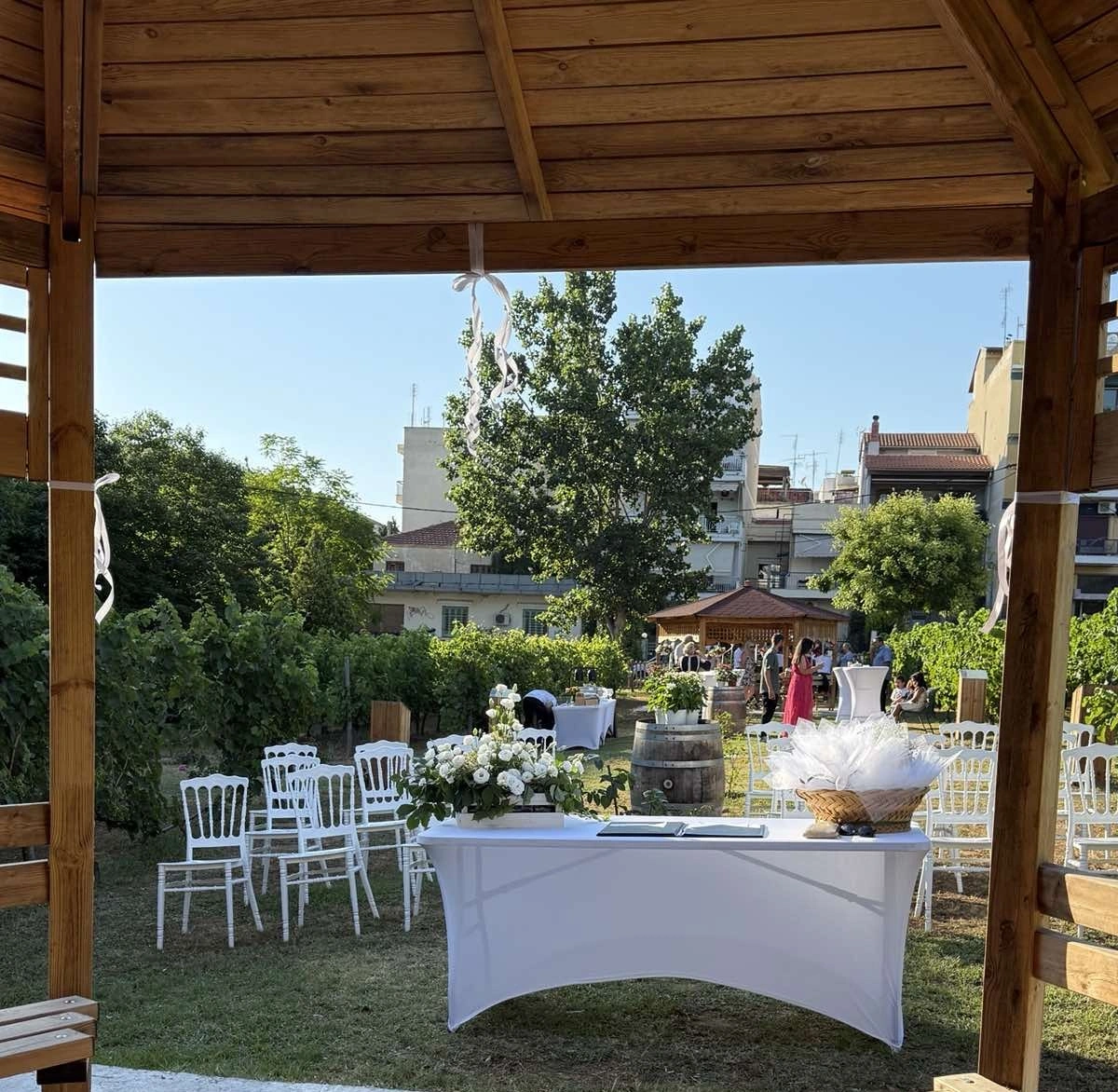 Το σκηνικό θυμίζει κινηματογραφική ταινία με τις άσπρες καρέκλες να είναι στοιχισμένες, αφήνοντας ένα διάδρομο μέσα στο φυσικό περιβάλλον για να σταθεί το ζευγάρι. Τα χρωματιστά μπουκέτα τοποθετημένα πάνω σε ξύλινα βαρέλια και οι κρεμασμένες κορδέλες στο κιόσκι συμπληρώνουν τη γαμήλια εικόνα, ενώ δεν θα μπορούσαν να λείπουν τα εδέσματα αλλά και τα κρασιά που λίγο μετά το μυστήριο θα απολαύσουν οι καλεσμένοι.