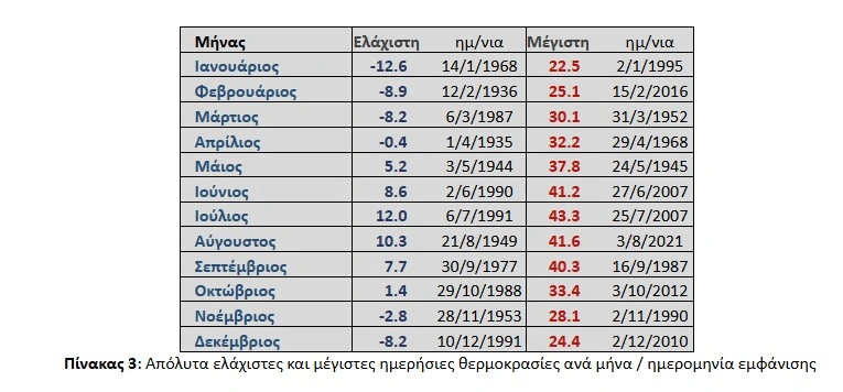 Ο πίνακας των απόλυτων ημερήσιων θερμοκρασιών αποκαλύπτει εντυπωσιακά στοιχεία. Η χαμηλότερη θερμοκρασία καταγράφηκε στις 14 Ιανουαρίου 1968, με -12,6°C, ενώ η υψηλότερη σημειώθηκε στις 25 Ιουλίου 2007, με 43,3°C. Ο Ιούνιος του 2007 ήταν επίσης ακραίος, με θερμοκρασία 42,5°C στις 26 του μήνα. Ο Απρίλιος του 2007 έφτασε τους 34,5°C, ενώ ο Οκτώβριος του 2012 σημείωσε 38,4°C, τιμή εξαιρετικά υψηλή για φθινοπωρινό μήνα.
