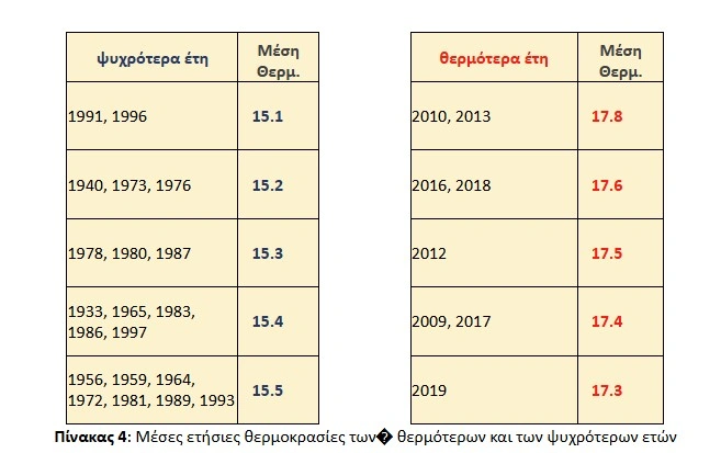 Αντίθετα, οι θερμότερες χρονιές καταγράφηκαν το 2010 και το 2013, με μέση ετήσια θερμοκρασία 17,8°C. Ακολουθούν τα έτη 2016 και 2018 με 17,6°C, ενώ το 2012 φτάνει τους 17,5°C. Οι χρονιές αυτές χαρακτηρίζονται από ιδιαίτερα θερμά καλοκαίρια και ήπιους χειμώνες. Το 2024, για παράδειγμα, ο Ιούλιος σημείωσε μέση θερμοκρασία 36,3°C, η υψηλότερη που έχει καταγραφεί για τον μήνα. Αντίστοιχα, ο Σεπτέμβριος του 2023 έφτασε τους 31,1°C, ξεπερνώντας κατά πολύ τον μέσο όρο.