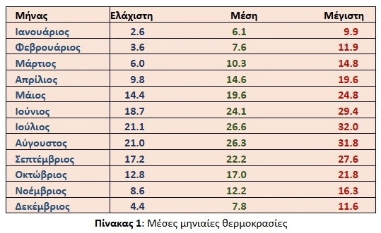 Η ανάλυση των μέσων μηνιαίων θερμοκρασιών δείχνει ότι ο Ιούλιος και ο Αύγουστος είναι οι θερμότεροι μήνες, με μέσες τιμές 26,6°C και 26,3°C αντίστοιχα. Οι μέγιστες φτάνουν τους 32,0°C και 31,8°C. Αντίθετα, οι ψυχρότεροι μήνες είναι ο Ιανουάριος και ο Δεκέμβριος, με μέσες θερμοκρασίες 6,1°C και 7,8°C αντίστοιχα. Οι ελάχιστες φτάνουν τους 2,6°C και 4,4°C.
