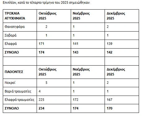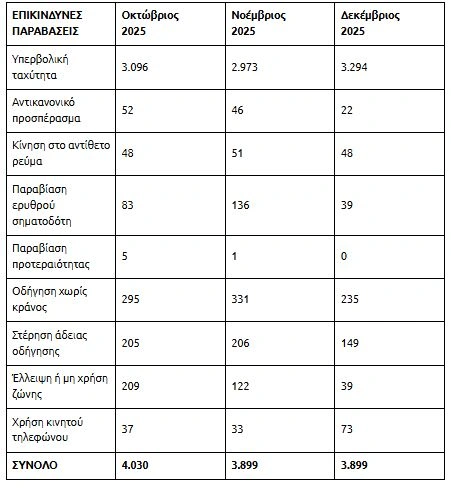 Την ίδια ώρα, κατά τους μήνες Οκτώβριο, Νοέμβριο και Δεκέμβριο του 2025 βεβαιώθηκαν συνολικά 11.828 επικίνδυνες παραβάσεις με τις 9.363 να αφορούν σε υπερβολική ταχύτητα.