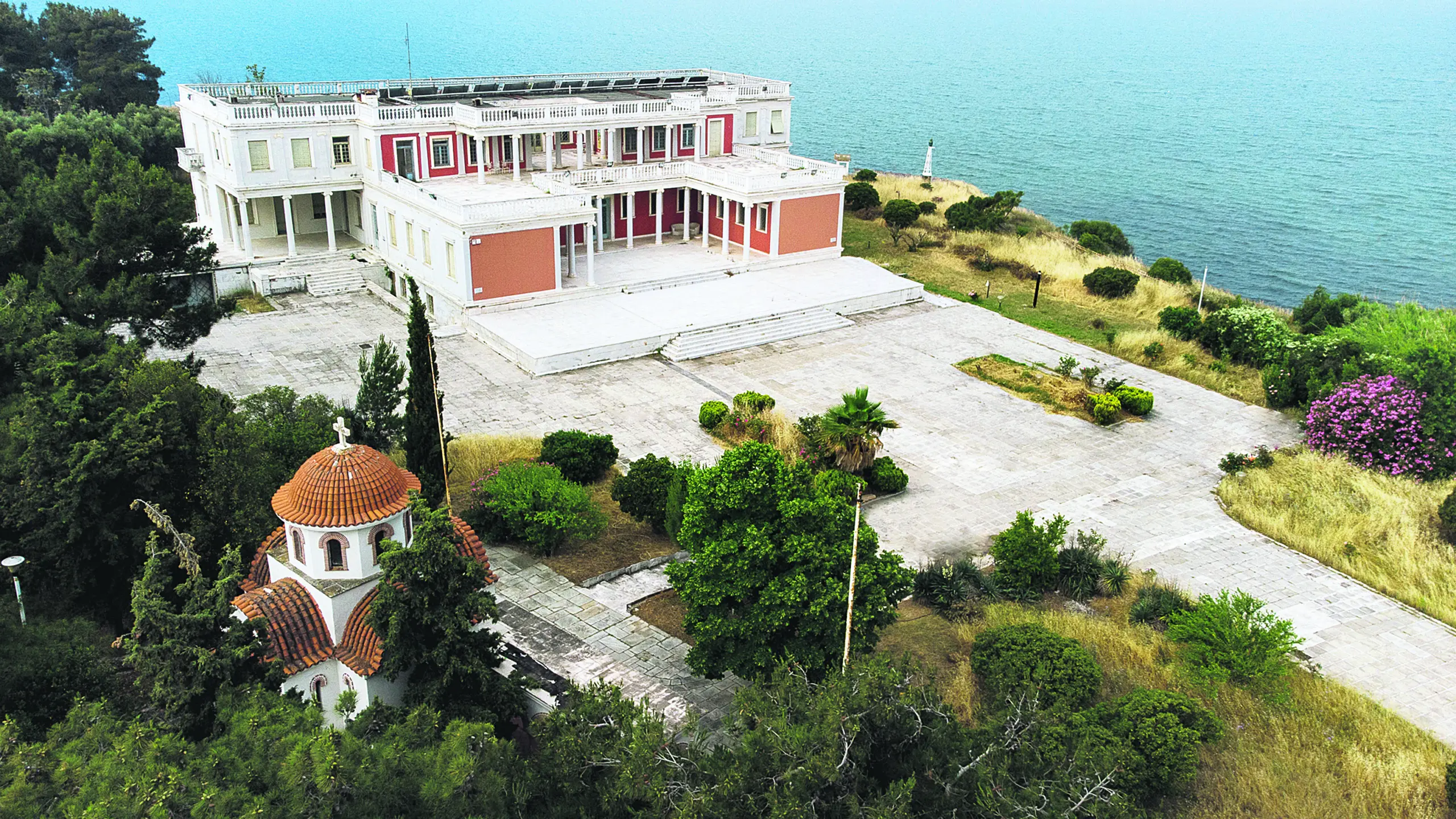Το πανέμορφο κτίριο, δείγμα «ανακτορικής» νεοκλασικής αρχιτεκτονικής με προπύλαιο, περιστύλιο και ιωνικούς κίονες, άρχισε να χτίζεται το 1955 από το υπουργείο Δημοσίων Εργων σε έκταση που παραχωρήθηκε από το υπουργείο Εθνικής Αμυνας. Οι χώροι περιλαμβάνουν μια κύρια πύλη με θαλάμους φρουράς, ένα παρεκκλήσι, ένα ελικοδρόμιο και πρόσβαση σε μια αποβάθρα στη θάλασσα. Η μπροστινή πρόσοψη του αρχοντικού χαρακτηρίζεται από μια ιωνική κιονοστοιχία δύο επιπέδων και μια μεγάλη μαρμάρινη αυλή. Μια κιονοστοιχία διατρέχει επίσης την πίσω πρόσοψη του αρχοντικού. Αυτό δημιούργησε άφθονο υπαίθριο χώρο που διευκόλυνε τη φιλοξενία μεγάλων υπαίθριων εκδηλώσεων. Το αρχοντικό αποτελείται από δύο βασικούς ορόφους που καλύπτουν 1.200 τετραγωνικά μέτρα. Οι αίθουσες υποδοχής του κοινού βρίσκονται στο ισόγειο, ενώ ο επάνω όροφος αποτελείται από δύο σουίτες και χώρους προσωπικού. Το υπόγειο περιέχει τις κουζίνες, το πλυσταριό, την αποθήκη και τους βοηθητικούς χώρους.