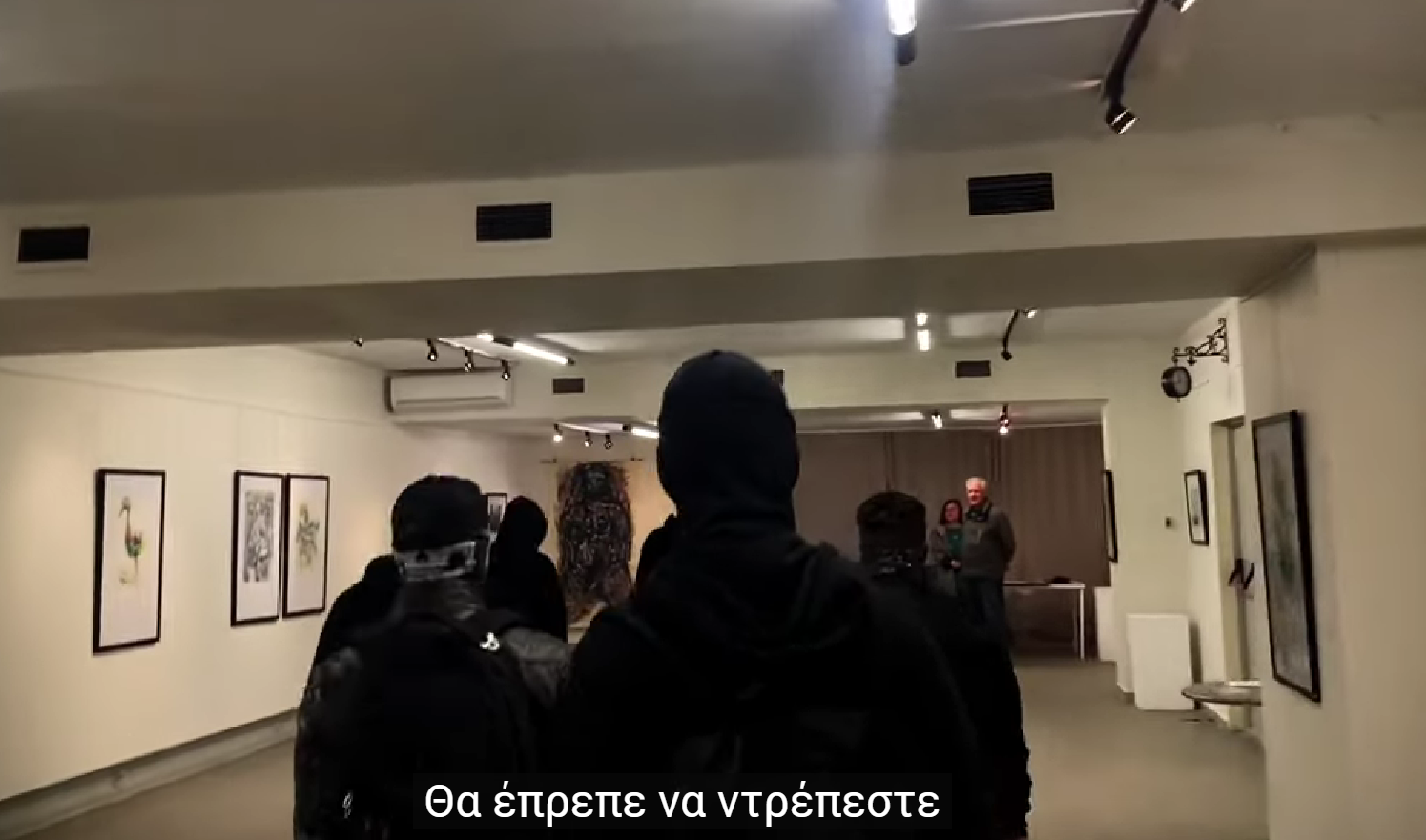 Ως δράστες της ενέργειας εμφανίζονται μέλη της Χρυσής Αυγής, όπως προκύπτει από σχετικό βίντεο που ανήρτησαν στο διαδίκτυο, όπου εμφανίζονται να υποχρεώνουν τους διοργανωτές να κατεβάσουν τα έργα και στη συνέχεια να βάζουν κόκκινες κορδέλες στην είσοδο, απαγορεύοντας την πρόσβαση, ενώ σκόρπισαν φυλλάδια με εθνικιστικό περιεχόμενο.