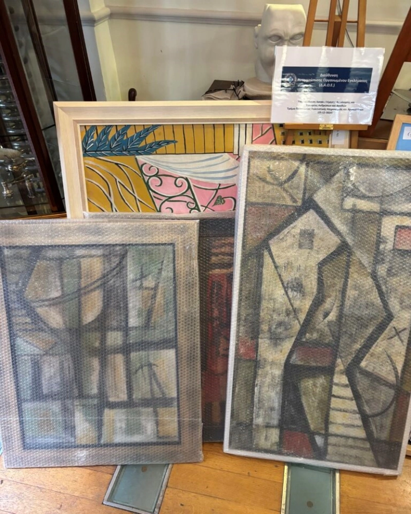 Μετά από έρευνα ταυτοποιήθηκαν και κατασχέθηκαν και τα 123 προς δημοπράτηση έργα, που εμφαίνονται ως έργα τέχνης διαφόρων καλλιτεχνών και ενδεικτικά αναφέρονται οι Αλέκος Φασιανός, Νίκος Χατζηκυριάκος-Γκίκας, Δημήτρης Μυταράς, Γιάννης Γαΐτης, Γιάννης Τσαρούχης, Γιάννης Σπυρόπουλος, Κωνσταντίνος Παρθένης, Γιώργος Σικελιώτης, Γιώργος Συρίγος, Δημήτρης Τηνιακός, Δώρα Μπούκη, Παναγιώτης Τέτσης.