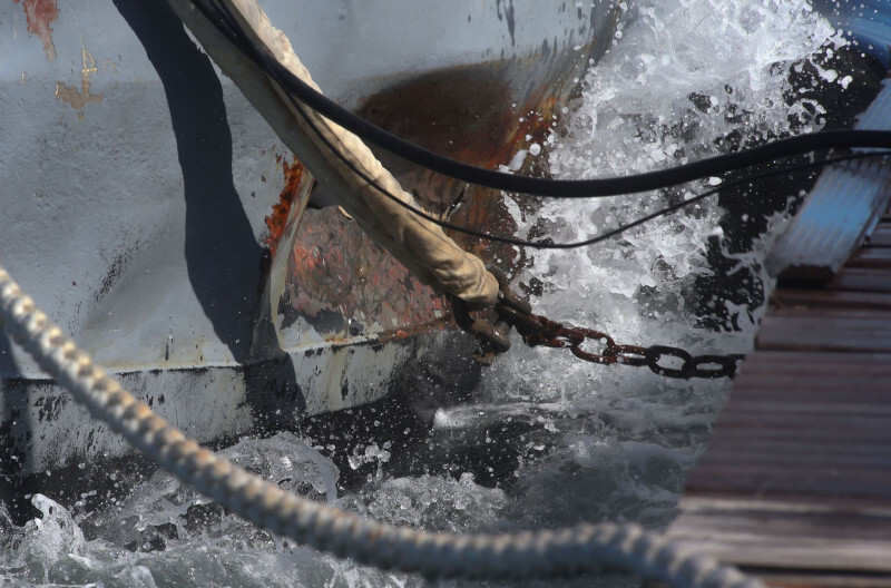 Σημαντικές φθορές προκλήθηκαν στην ξύλινη επένδυση της παραλίας – προκυμαίας μπροστά στο πλοίο αλλά και στην πρύμνη του πλοίου, που προκλήθηκε ρήγμα.