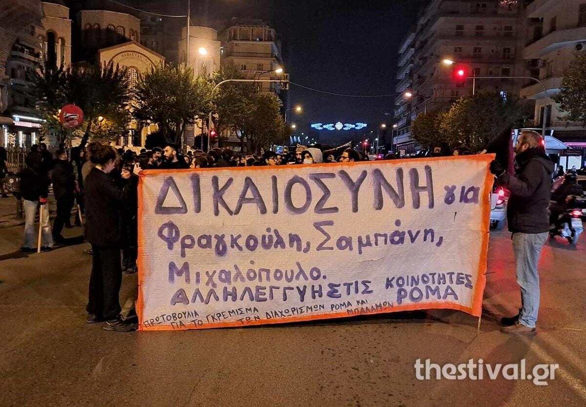 «Δικαιοσύνη» και «ο αντιτσιγγανισμός οπλίζει το κράτος», γράφουν δύο από τα πανό που κρατούν οι διαδηλωτές που συμμετέχουν στην πορεία, ενώ φωνάζουν συνθήματα κατά της αστυνομίας. Την πορεία συνοδεύουν δυνάμεις των ΜΑΤ, όπως μεταδίδει το Thestival.gr.