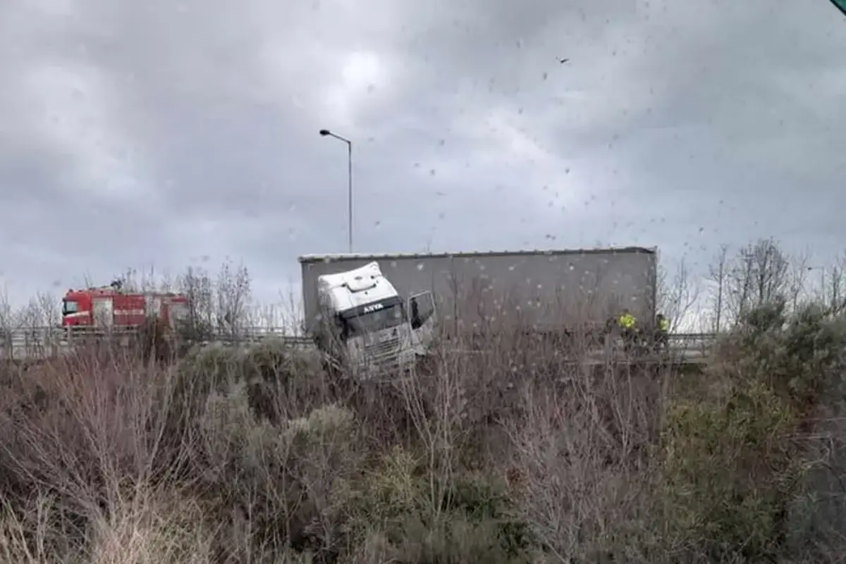 Το φορτηγό για άγνωστους λόγους εξετράπη της πορείας του με αποτέλεσμα να βρεθεί στο κενό.