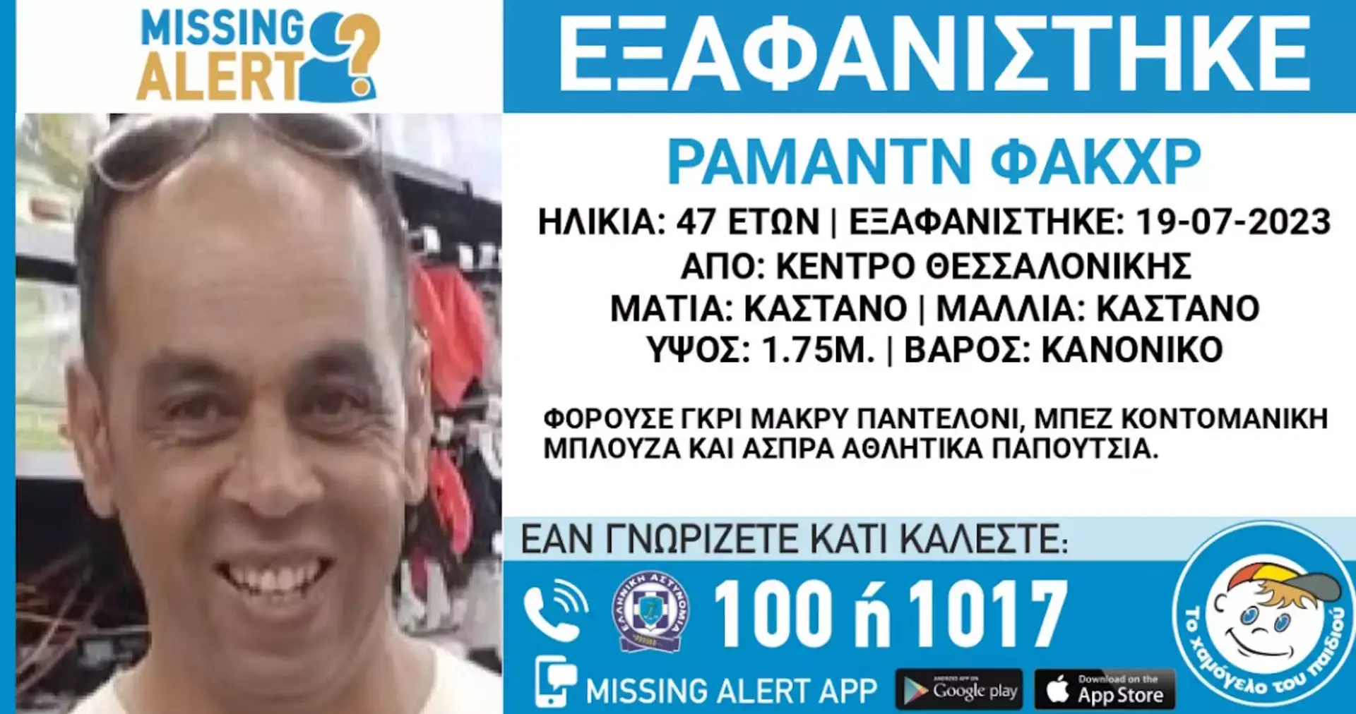 Την εξαφάνιση του Ραμάντν Φακχρ, 47 ετών από τη Θεσσαλονίκη έκανε γνωστή σήμερα Πέμπτη, 27 Ιουλίου το «Χαμόγελο του Παιδιού» με ανακοίνωσή του. Τους τελευταίους περίπου έξι μήνες βρισκόταν στην Ελλάδα.
